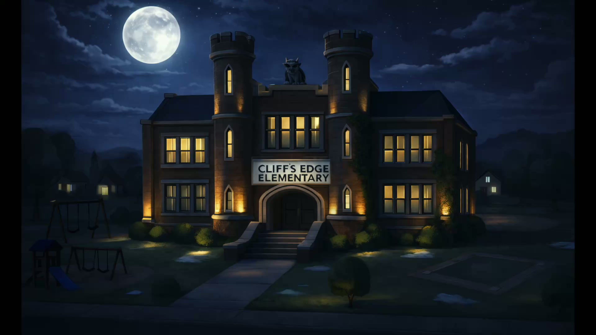 Welcome to Cliff's Edge... Nothing ever happens here... Today’s forecast: 40% chance of frogs, isolated howling after sunset.... Welcome to Cliff's Edge... Nothing ever happens here... BREAKING: Gargoyle statue on school roof definitely NOT blinking... TRAFFIC: Avoid Cliff's Edge Ave due to unusually large footprints... Frankenstein Fear Park Opens Soon... Cliff's Edge Elementary Closed due to tremors...